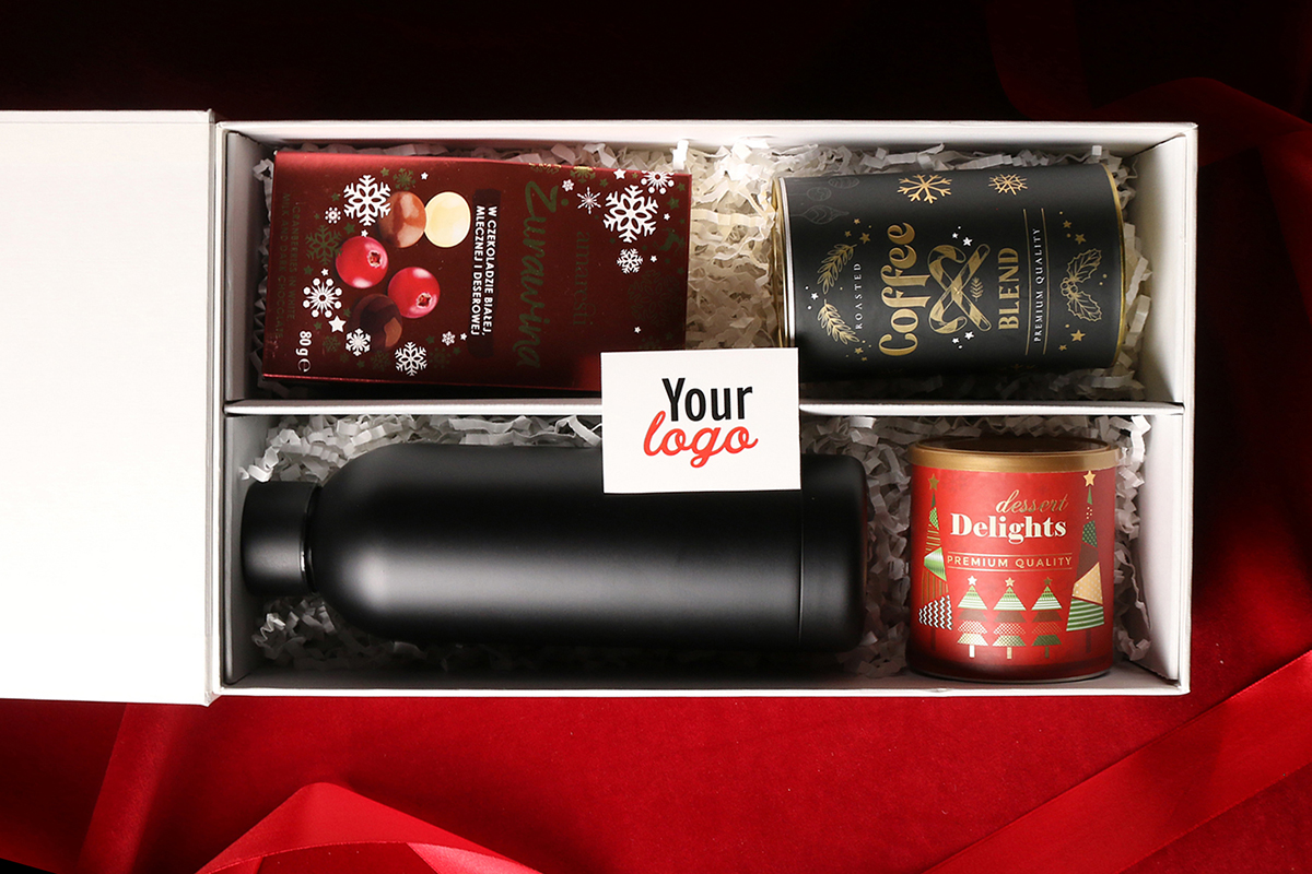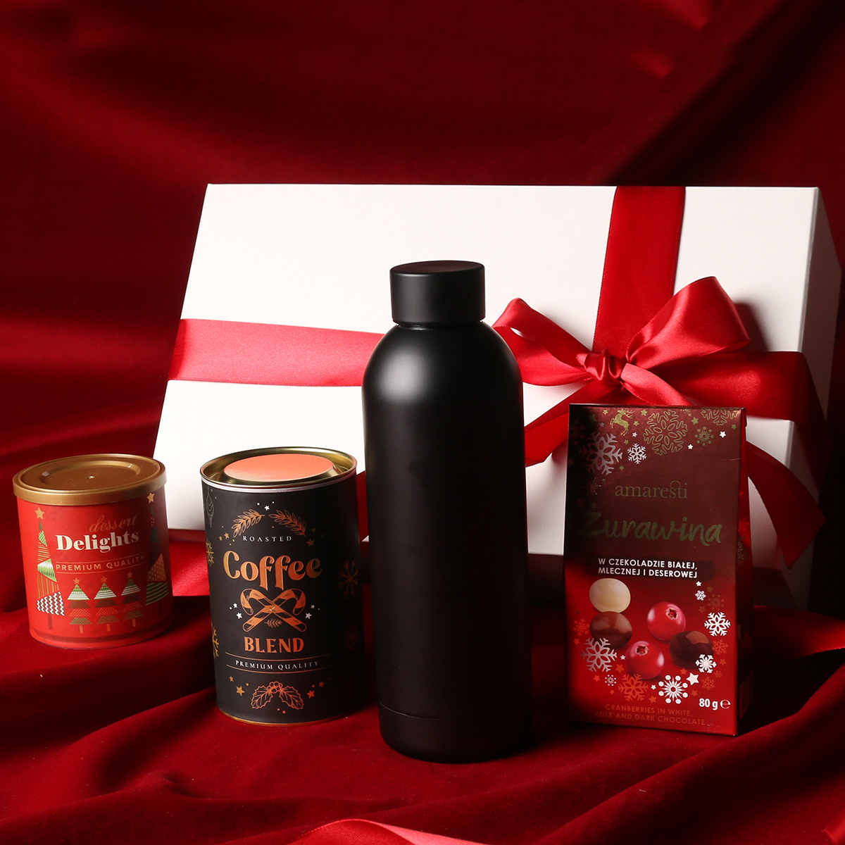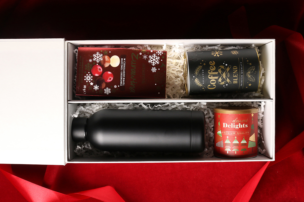 Praktyczna butelka termiczna Apollo czarna Praliny żurawina w czekoladzie białej, mlecznej i gorzkiej Aromatyczna kawa ziarnista Arabica Brazil Cerrado Mineiro w puszce 150g Delikatne Delights Pralines - czarna porzeczka w białej czekoladzie w pudrze malinowym 80g Ekskluzywne opakowanie zamykane na magnes z możliwością dodania pasującej wstążki i obwoluty
